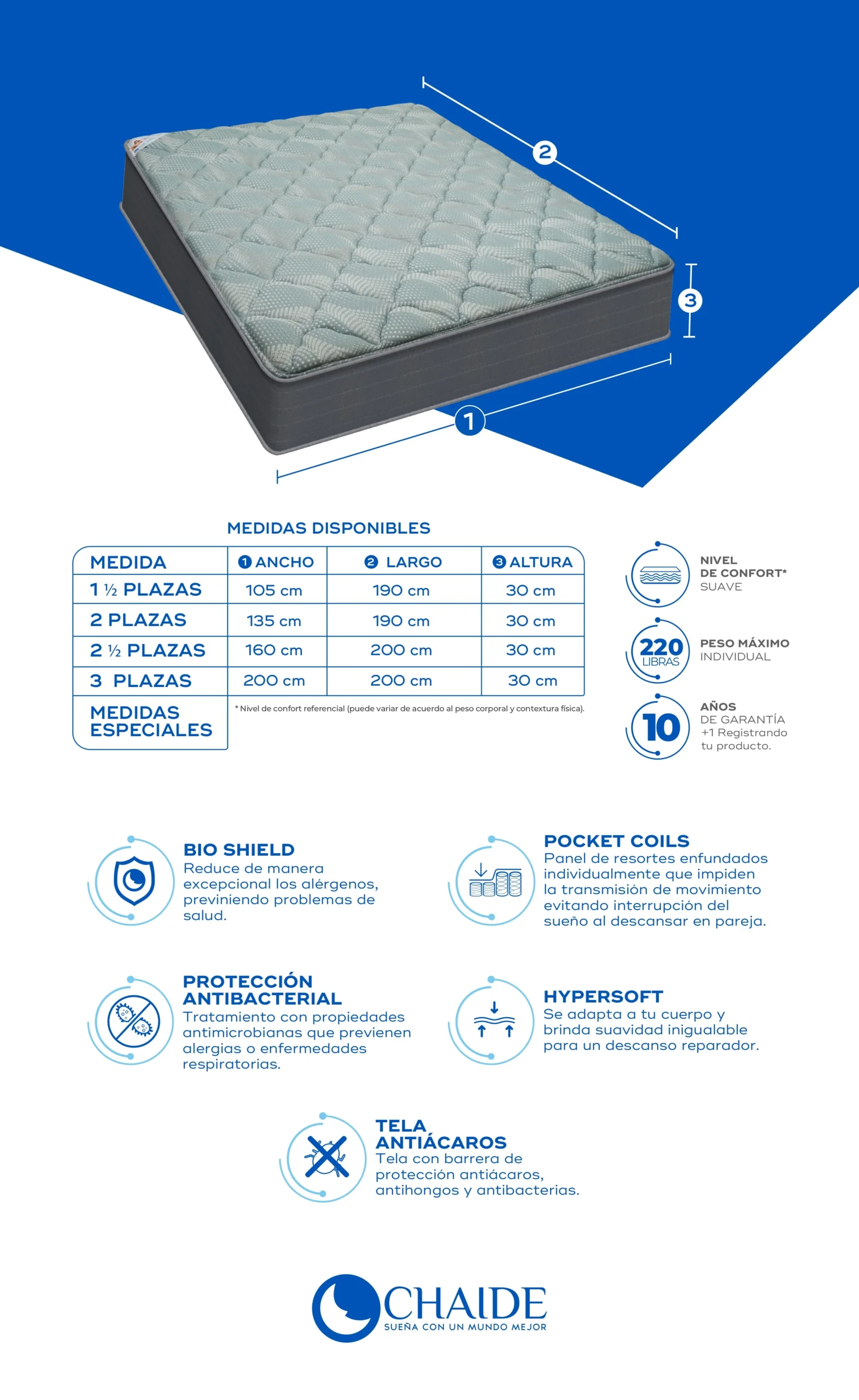 | Tamaño | 105 cm x 190 cm x 30 cm, 135 cm x 190 cm x 30 cm, 160 cm x 200 cm x 30 cm, 200 cm x 200 cm x 30 cm, Medidas especiales |