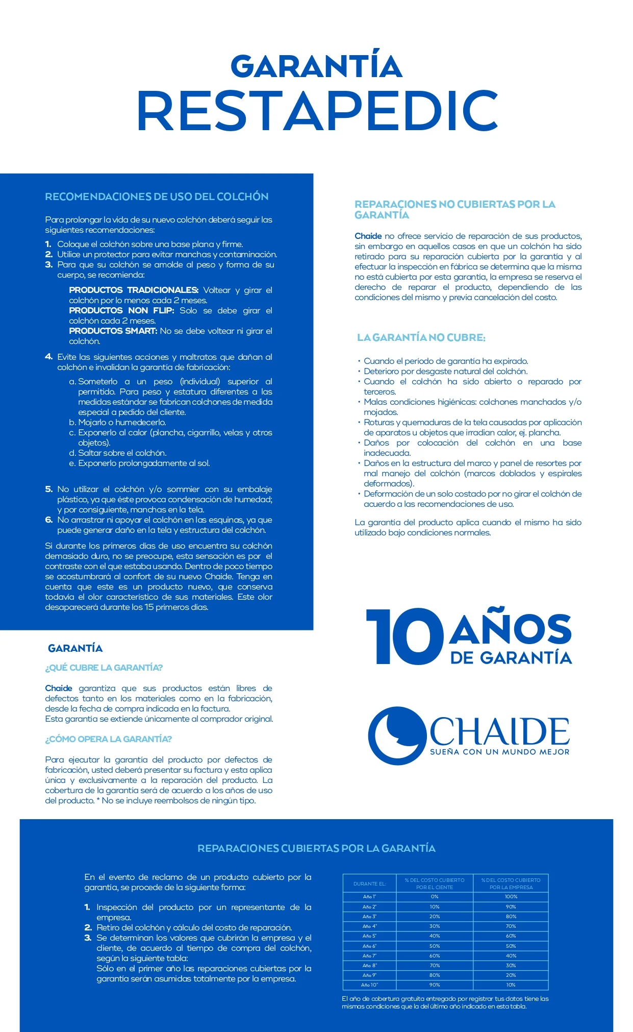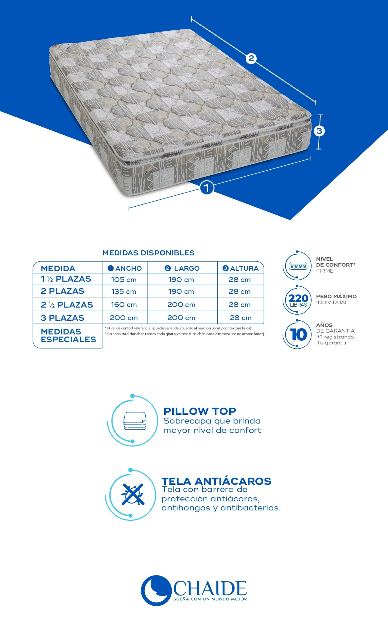 | Tamaño | 80 cm x 190 cm x 28 cm, 90 cm x 190 cm x 28 cm, 105 cm x 190 cm x 28 cm, 135 cm x 190 cm x 28 cm, 160 cm x 200 cm x 28 cm, 200 cm x 200 cm x 28 cm, Medidas especiales |