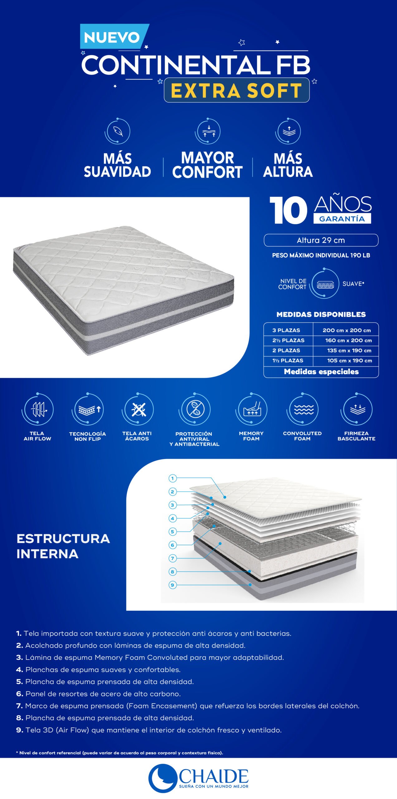 | Tamaños | 200 cm x 200 cm x 29 cm, 160 cm x 200 cm x 29 cm, 135 cm x 190 cm x 29 cm, 105 cm x 190 cm x 29 cm, Medidas especiales |