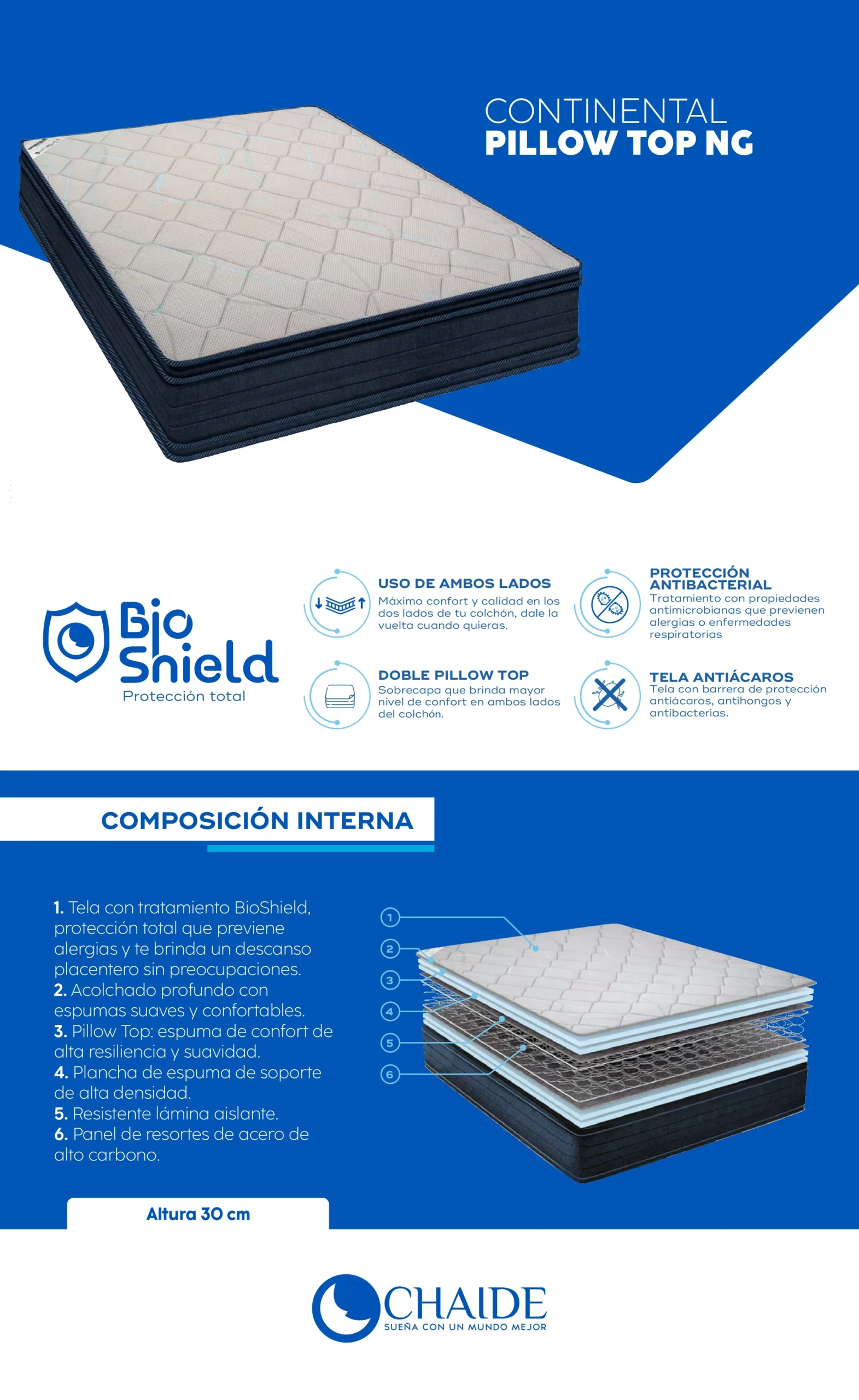 | Tamaño | 105 cm x 190 cm x 30 cm, 135 cm x 190 cm x 30 cm, 160 cm x 200 cm x 30 cm, 200 cm x 200 cm x 30 cm, Medidas especiales |