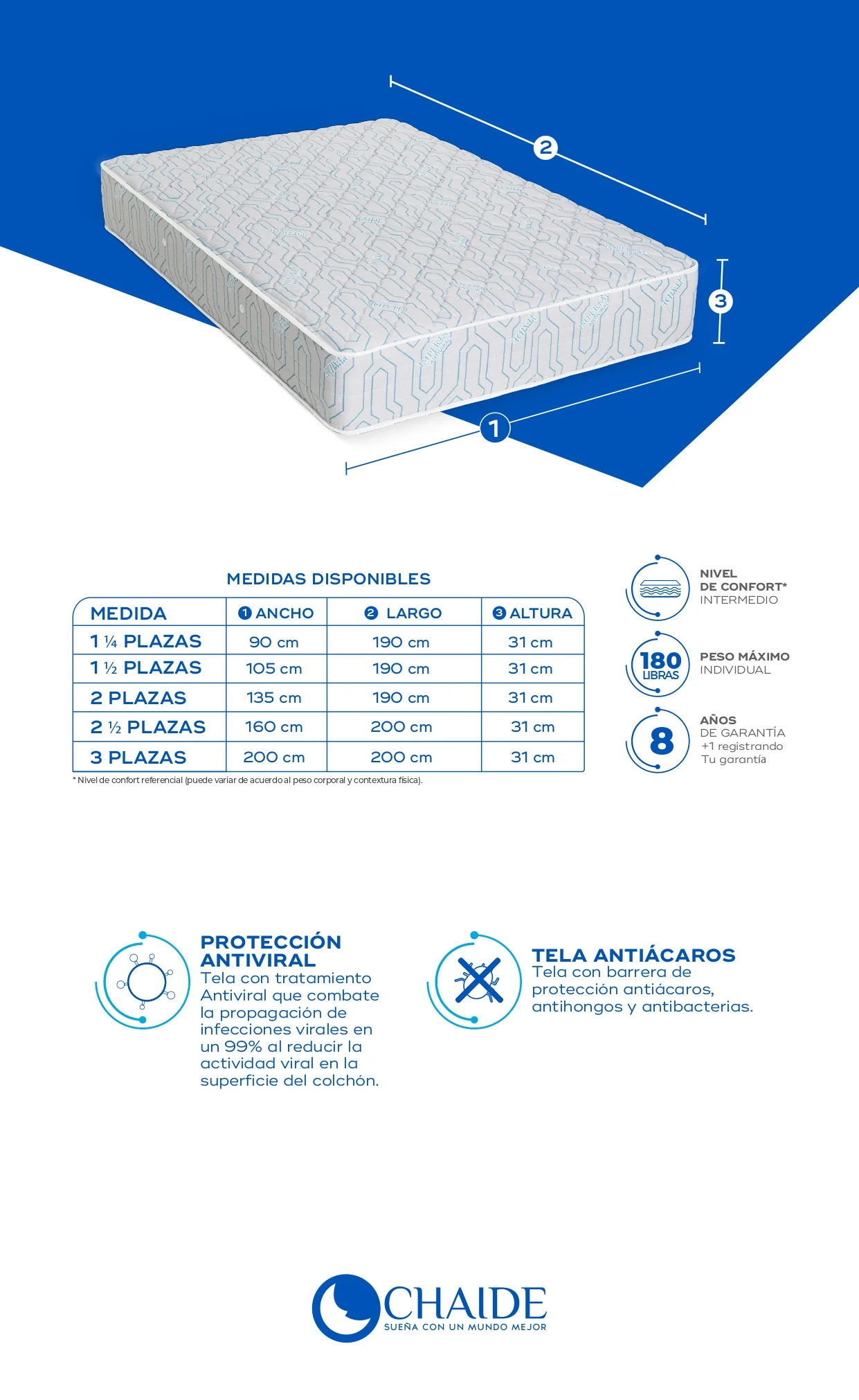 | Plazas | 1 ¹/₄ Plazas, 1 ½ Plazas, 2 Plazas, 2 ½ Plazas, 3 Plazas, Medidas especiales |