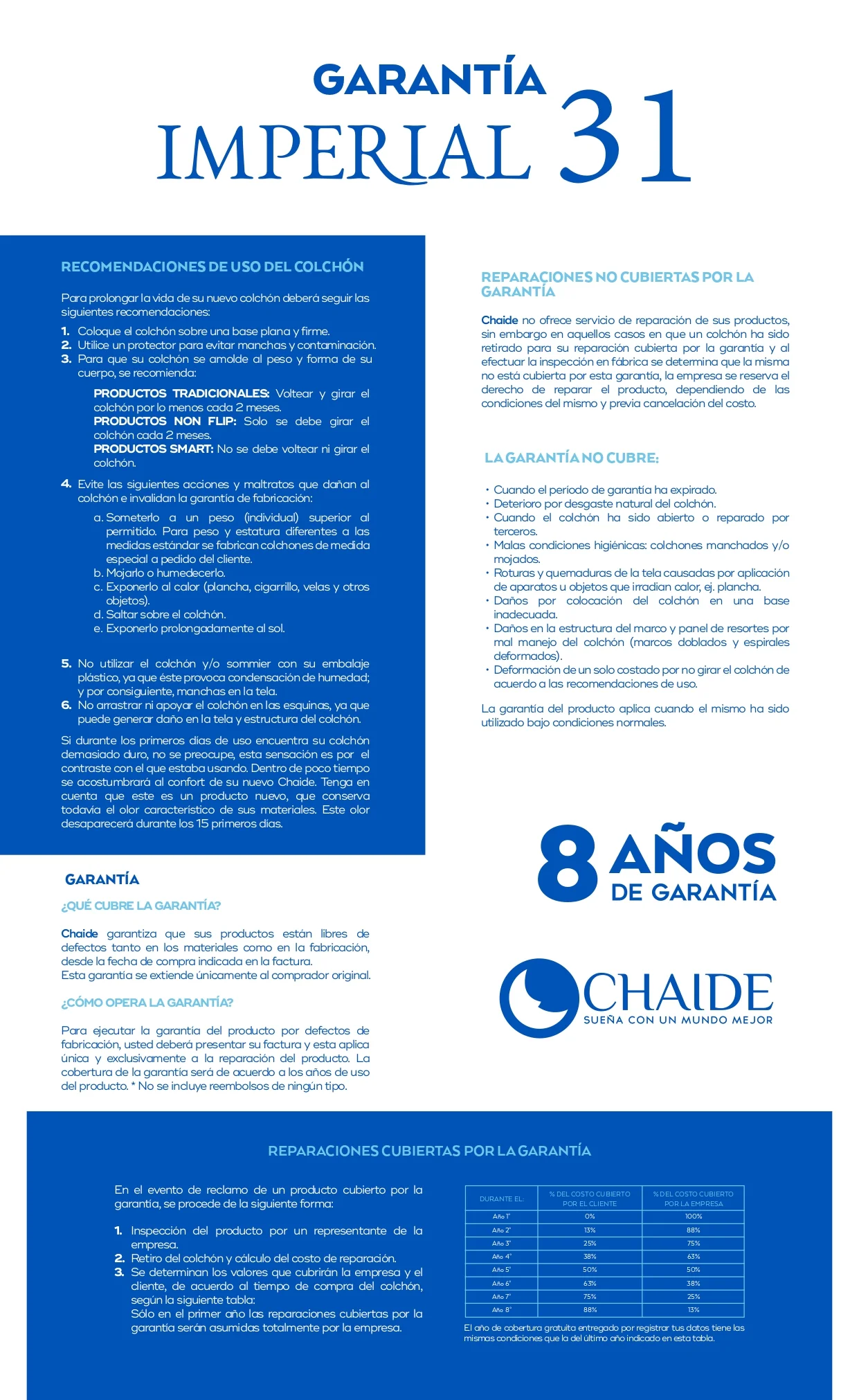 | Tamaño | 90 cm x 190 cm x 31 cm, 105 cm x 190 cm x 31 cm, 135 cm x 190 cm x 31 cm, 160 cm x 200 cm x 31 cm, 200 cm x 200 cm x 31 cm, Medidas especiales |